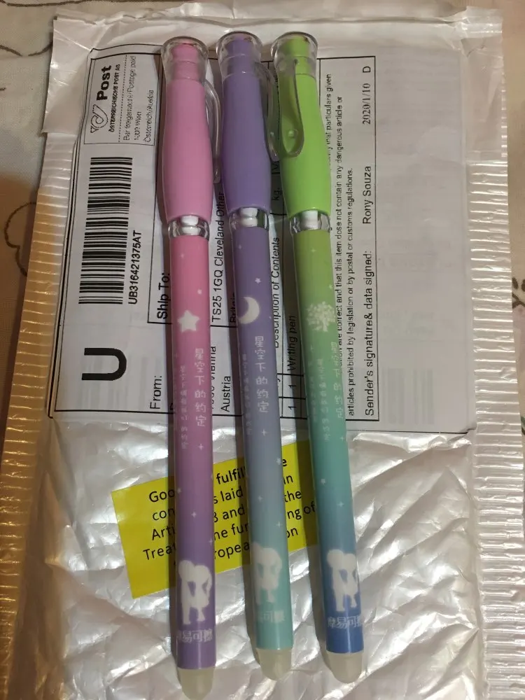 Ordered 23.12. Otrzymano 21.01. All pens write a rubber bands them wycierają. Daughter is zachwycona!